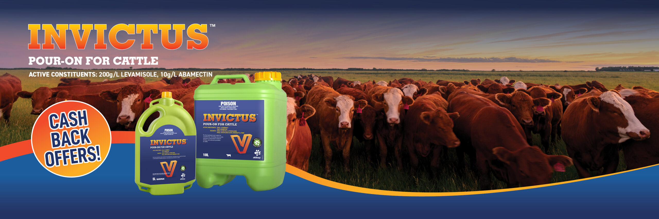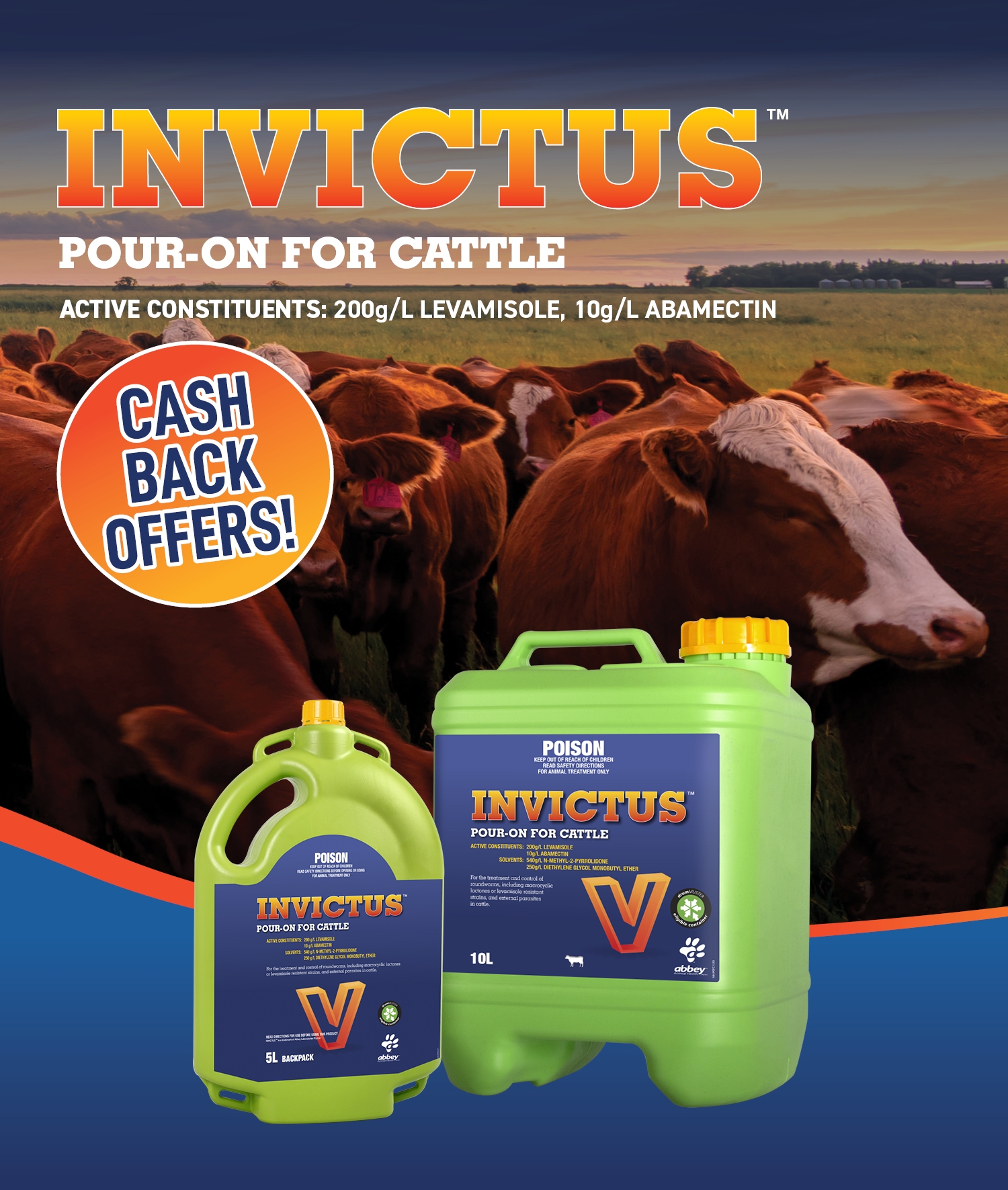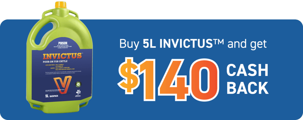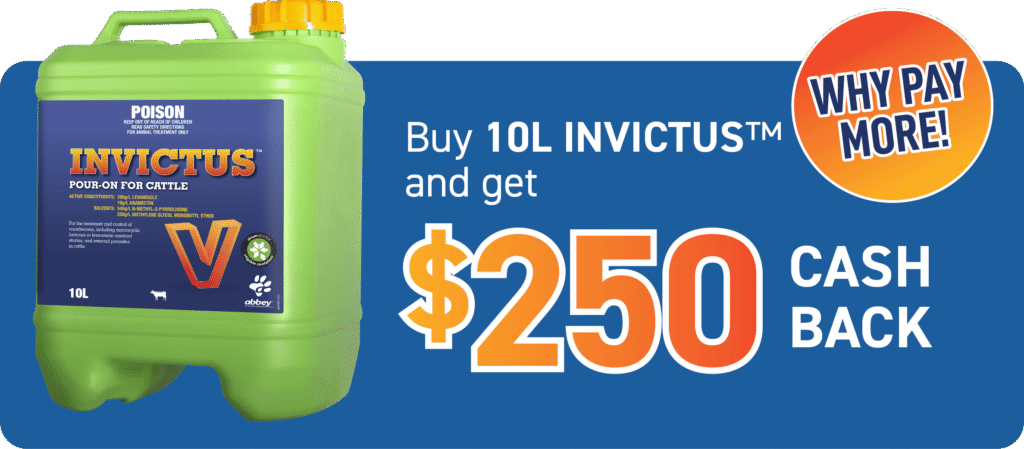 Aust. Residents, 18 years and older. Starts 01/04/2026 & ends 11.59pm AEDST on 30/6/2026. Redemptions accepted until 30/09/2026. Retain copy of receipt as proof of purchase. Receive $250 cash back per drum of INVICTUS™ Pour on for Cattle 10L and $140 cash back per 5L backpack of INVICTUS™ Pour on for Cattle from an accredited Abbey Animal Health agent. Redemptions must be claimed via https://abbeylabs.com.au/2026/03/11/invictus-pour-on-for-cattle-offer/ Promoter: Abbey Animal Health Pty Ltd(ABN 19164159764) OF Unit 27 Maitland Place, Norwest 2153. This promotional offer is only open to Australian residents. 1. To receive your cash back fill in your details on this webpage. Upload an image of your invoice/receipt, hit submit. 2. The cash back offer is only valid for purchases made between 1st April’26 – 30th June’26. There is no restriction on number of products bought by one producer. 3. Abbey Animal Health does not guarantee a cash back if image of invoice/receipt is not uploaded on web address provided. 4. You can claim multiple purchases during the specified promotion period. 5. Not valid with any other Abbey Animal Health offer. 6. Cash back may take up to 8 weeks from the time of submission of claim.