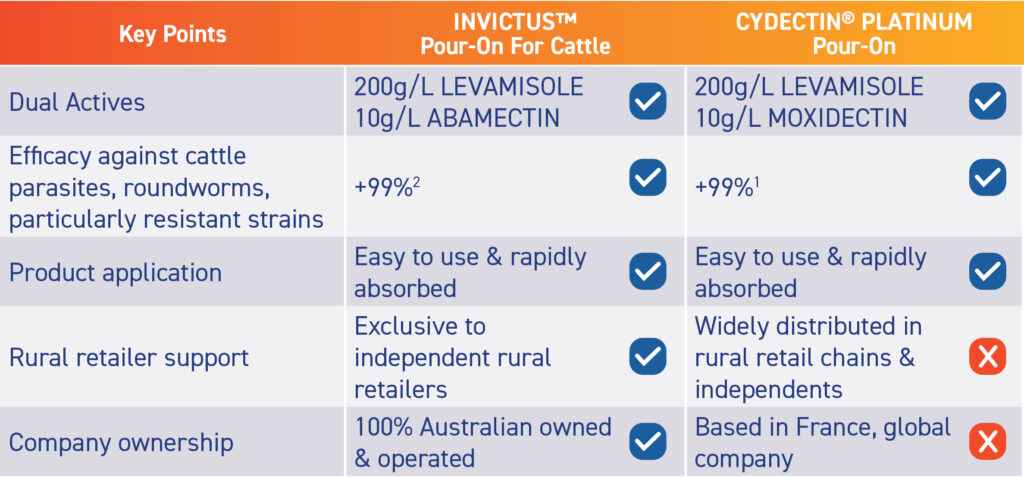 1. Virbac Australia website June, 2023 – CYDECTIN® PLATINUM – Product Benefits page – Unrivalled Worm Control claim/ efficacy. 2. As supported by evidence from published literature. CYDECTIN® is a registered trademark of Virbac (Australia) Pty Limited. INVICTUS™ is a trademark of Abbey Laboratories Pty Ltd.